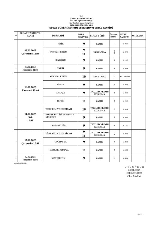 OKULUMUZ ŞUBAT DÖNEMİ SORUMLULUK SINAVI SINAV TAKVİMİ